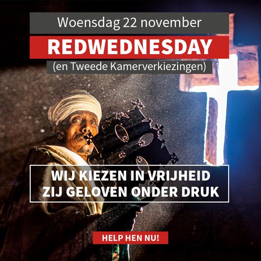 Op RedWednesday© kleuren in Nederland ruim 150 en wereldwijd honderden kathedralen, kerken, kloosters, monumenten en openbare gebouwen bloedrood. Waarom? Om aandacht te vragen voor het lot van miljoenen vervolgde, onderdrukte en bedreigde gelovigen in de hele wereld. Ook onze kerk zal weer in her rood verlicht worden. Met om 17:00 uur een RedWednesday Vespers.